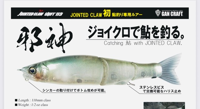 #新製品 #鮎専用 #ガンクラフト #邪神 【ジョイクロで鮎を釣る!】鮎ルアーゲーム専用「ジョインテッドクロー シフト 113 邪神 #1〜#5 販売価格¥4.180(税込) #6〜#8 販売価格¥5.280(税込) 鮎ルアーゲーム専用のジョイクロ「ジョインテッドクロー シフト 113 邪神」。 ジョイクロと言えば鮎。流れの中でキレイにS字を描くように作り込んでいった所、最終的にアユの形になった…という逸話もあったりして。そう、鮎ルアーゲーム専用のジョイクロは“必然”であると。 ジョイクロで鮎を釣る時代がやってきた。GANGRAFT初の鮎専用設計ルアー誕生。 JOINTED CLAWがついに鮎専用モデルとして進化。 ライン操作で苔をはむリアルな鮎を完全再現。 独自のリップレス設計+ROMダンパーが流れの速さに応じてアクションを変化。 ハリス止めはステンレスビスで交換可能。