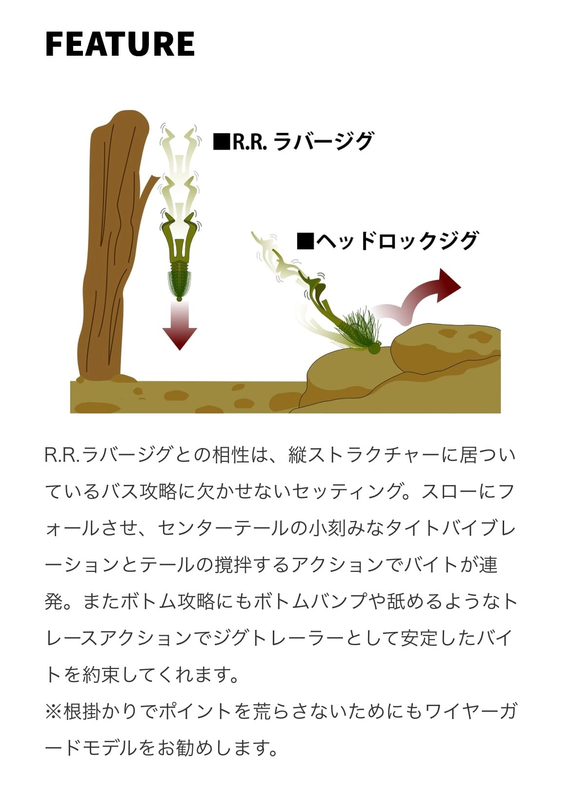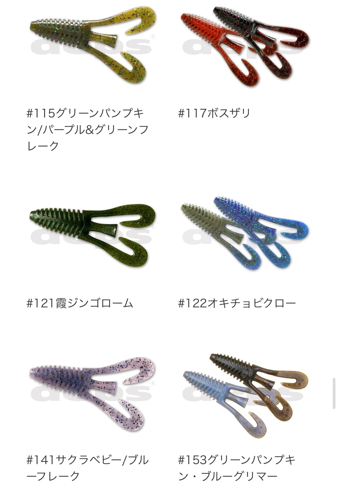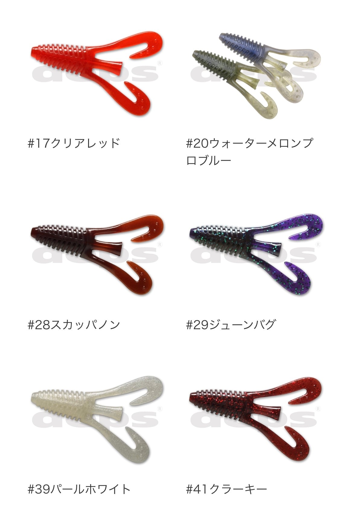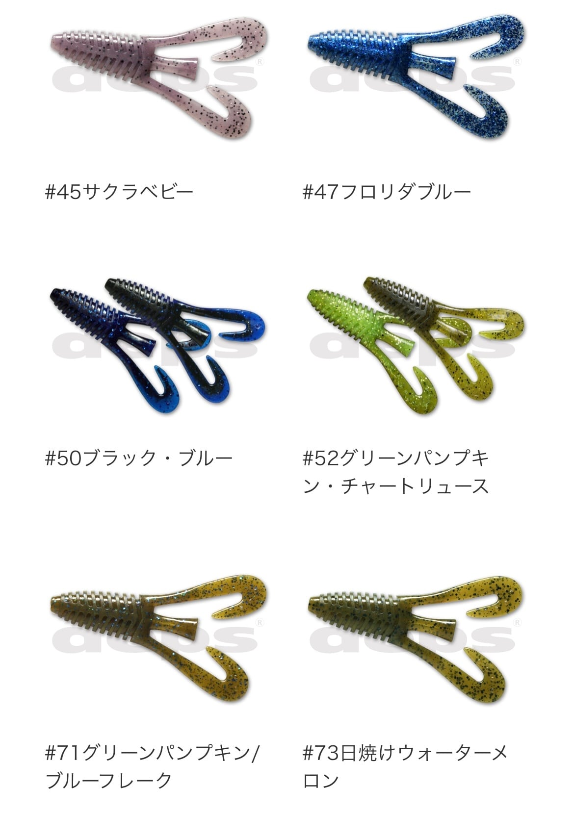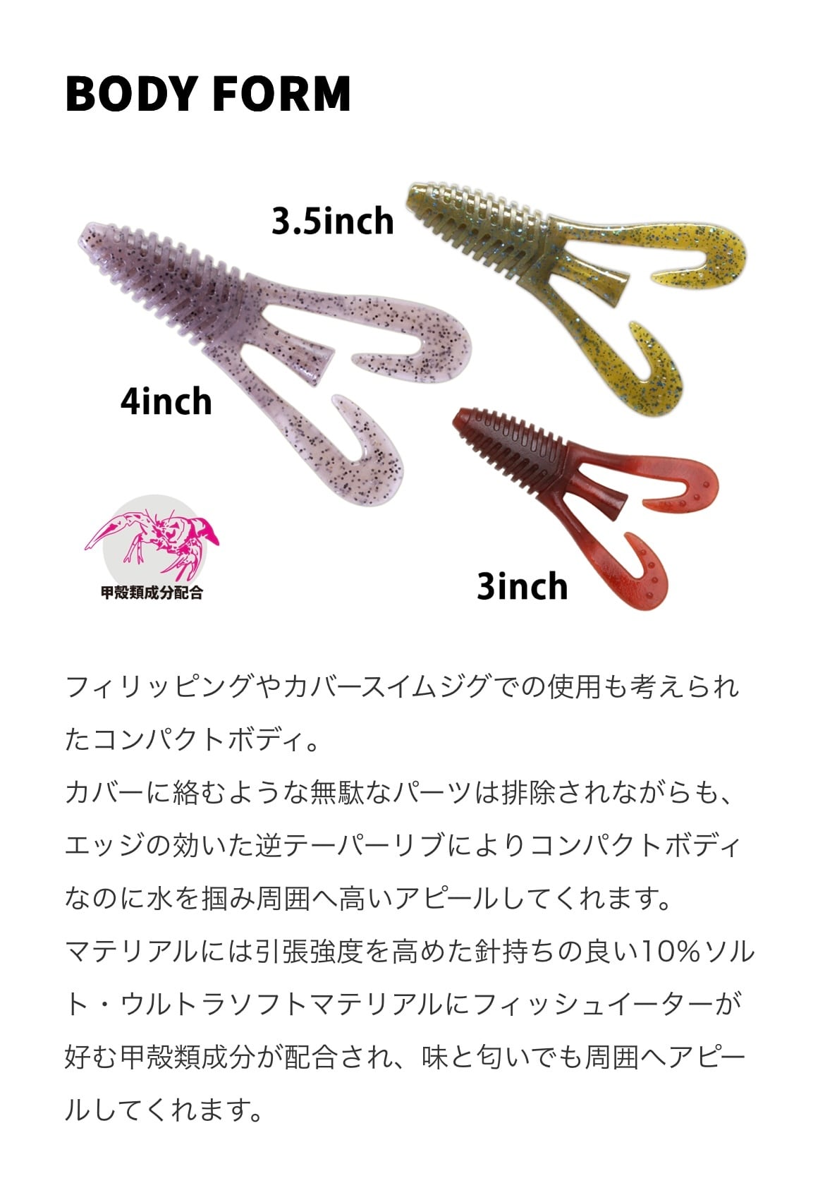 一見シンプルなデザインだが、ボディには水を掴み纏うエッジの効いた逆テーパードリブ、ショートレンジやスローなアクションでも水を掴み良く動くテール、センターテールは小刻みに揺れる微振動やキックバックアクションとジグトレーラーだけではなくテキサスやダウンショットといった様々なリグにも対応することができる“バルビュータ”はここぞの1本を約束してくれるオールマイティ・ソフトベイトです。