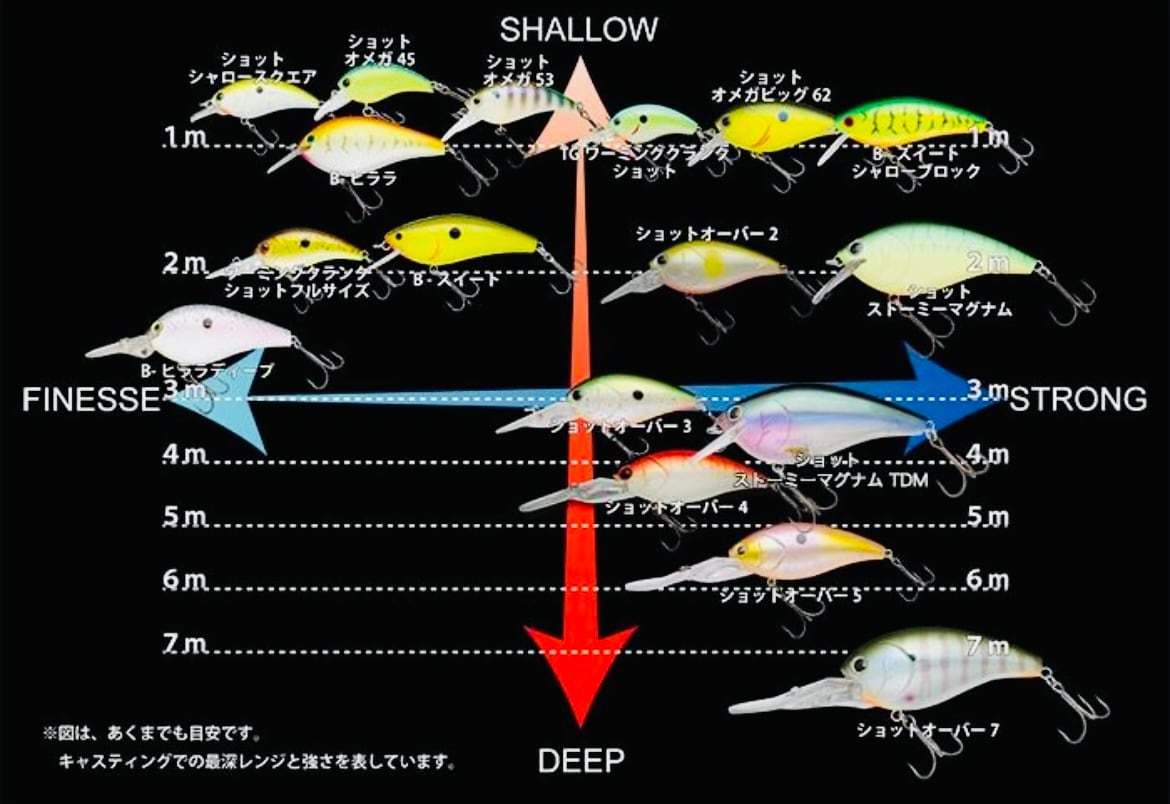 ショットオーバーシリーズで水深2m前後をカバーするアイテムが「ショットオーバー2」。タングステン、スチール、ブラスを組み合わせたウエイトバランスと、リップをリセッティングすることで、「ショットオーバー3」と同ボディーでありながら1レンジ浅く、しかもシリーズ共通のミッドウォブル&ハイピッチ明滅ロールを実現。高い障害物回避能力をも合わせ持つ優れたアクションに仕上がっています。リップ裏面のキャスティングフィンとタングステンウエイトの効果で風の中でも軌道確保したロングキャストが可能です。もちろんボディーマテリアルのボーンとクリアの使い分けや、単発ラトルのローサウンドもシリーズを踏襲。どんなレイクでも活躍できる2mダイバーで、ショットオーバーシリーズの爆発力を体感してください。