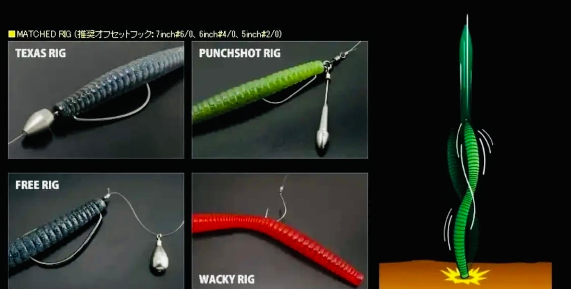 ウィードジャングルもスルリとすり抜けるシンプルなアウトラインながらも、フロントとリアボディの異なる形状が生み出す複雑な水流波動、不規則に生々しく蠢くアクション、そして着底時にバルキーボディが跳ね返るリバウンドアクションで、老獪なビッグバスに思わず口を使わせてしまうバルキースティックワームです。