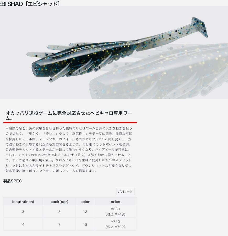甲殻類の足と小魚の尻尾を合わせ持った独特の形状はワーム自身に大きな動きを狙うのではなく、「細かく」「優しく」そして「反応良く」をテーマに開発。