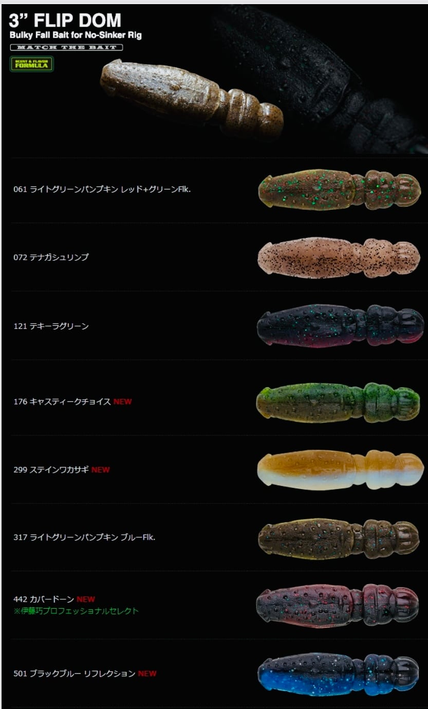 タフコンディション下のバスをもバイトに持ち込むことができるフォールベイトが「フリップドム」。甲殻類を思わせる独特のシェイプは、ノーシンカーでの水平フォール姿勢を維持し、フォール時には左右に揺れながら自発的なアクションを生むバランスを追求してデザイン。また、フックポイントをしっかりホールドできるデザインにより、スナッグレス性を大幅に向上させています。ワーム単体で約14gと重さを持たせてあるため、MHクラスのパワーロッドでも容易に操作可能。幾重にも折り重なるブッシュやカバーの奥までもスキッピングで送り込み、そのアクションでバスを陥落させることができるアイテムです。