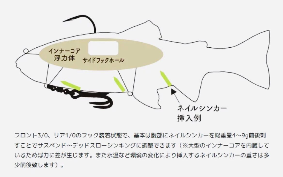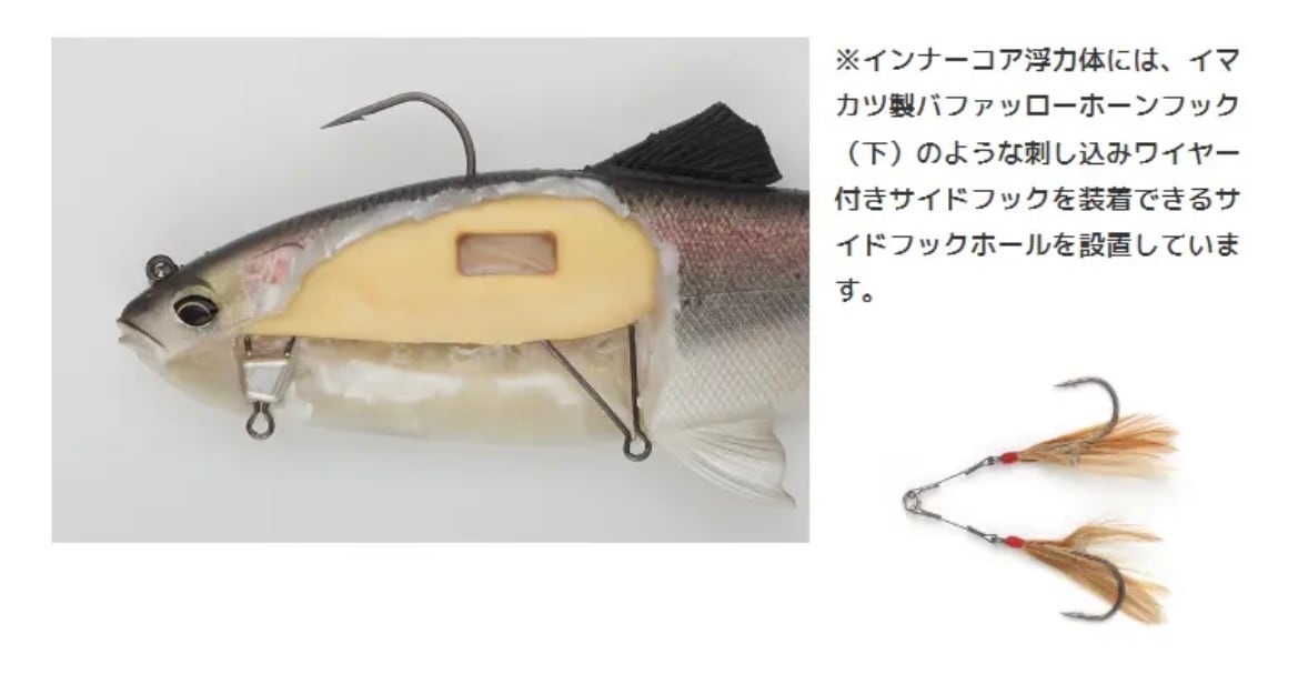 レイジースイマー9インチは究極のデッドスローリトリーブでも振り子のようにしっかりと左右に尾を振り、強力な水押し集魚パワーを発揮する、動きも見た目も超リアルなフローティングスイムベイトです。