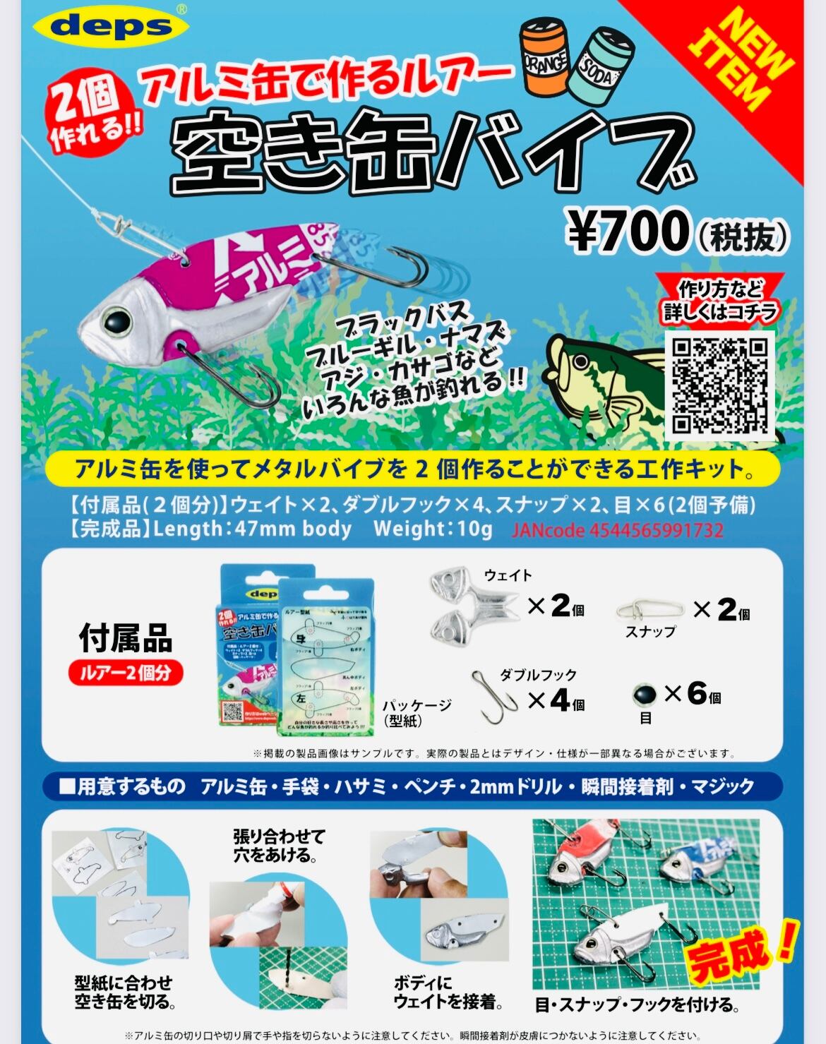 アルミ缶を切り取りルアーのボディにすることで、簡単にバイブレーションが作れる工作キット。