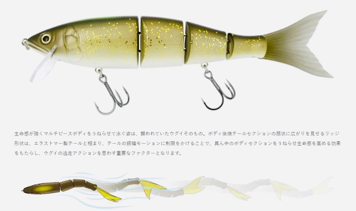 発泡樹脂ボディの初代ハイサイダー(2007年~2017年)とは似て非なるジョイント角、ウェイトバランス、ボディ形状でセッティングを施し、ABS樹脂製中空ボディに長めの極薄エラストマーテールでウグイの動きを忠実に再現しています。