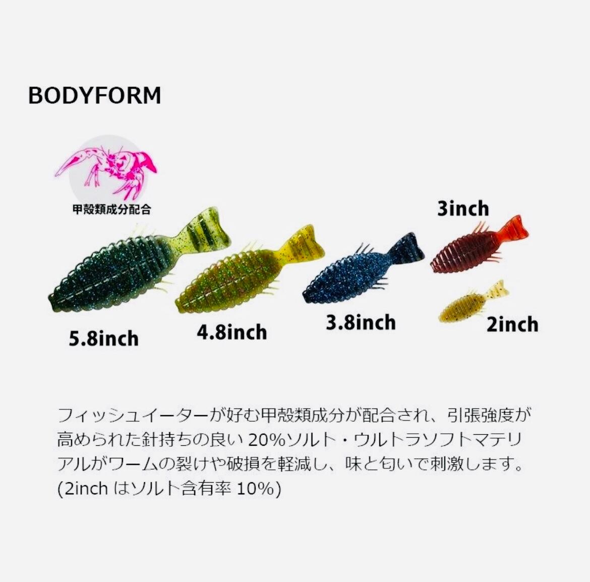 広大なフィールドから野池や河川などあらゆるフィールドに生息するブルーギル、またキャスタビリティを崩さない手返しの良いサイズにまとめ上げられたブルーギルフォルムの“ブルフラット”は、僅かな水流も掴む蛇腹状テールやピリピリとした微振動を起こすアームと独特なフォールアクションは、ブルーギルが盛んに泳ぎ回る仕草を見せてくれます。